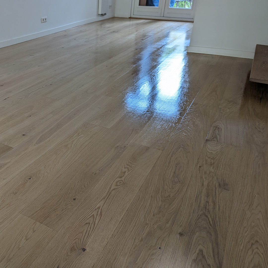 Daarnaast is lakken ook echt een vak apart. Je moet de lak egaal aanbrengen, zonder aanzetten of glansverschil, en de ruimte moet stofvrij zijn. Eén verkeerd moment en je ziet straks stofjes, strepen of doffe plekken terug in het eindresultaat. Het zijn dingen die je misschien pas merkt als de vloer al droog is — en dan is het eigenlijk te laat. Het kost dan vaak juist meer geld om de fouten te herstellen dan wanneer je het werk meteen laat doen.
